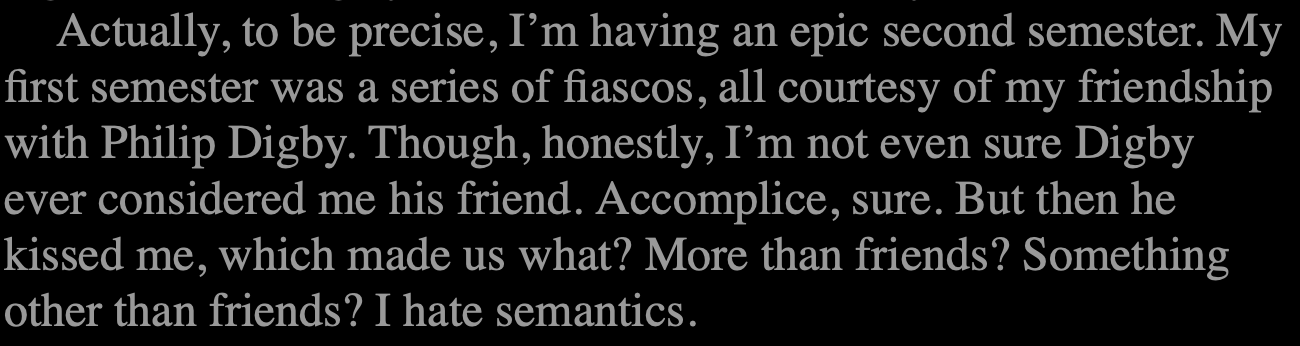 Image Description 1: White letters on black text read: Actually, to be precise, I’m having an epic second semester. My first semester was a series of fiascos, all courtesy of my friendship with Philip Digby. Though, honestly, I’m not even sure Digby ever considered me his friend. Accomplice, sure. But then he kissed me, which made us what? More than friends? Something other than friends? I hate semantics.
